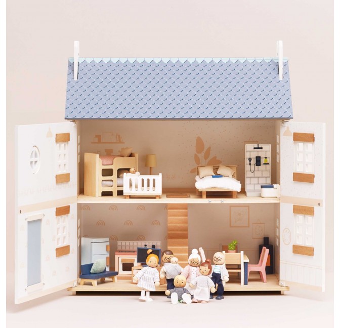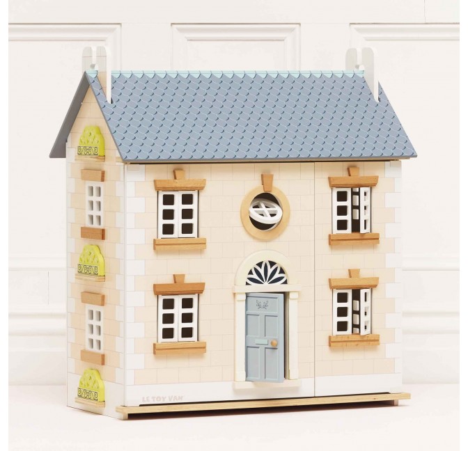 Inspire small world play with this one of a kind, timeless toy. Made from sustainable FSC™- certified wood and painted in pretty pastel pink, white and grey hues using non-toxic water based dyes, this deluxe 3 storey home is fully decorated inside and out. A thoughtful heirloom gift to treasure and pass down through generations.