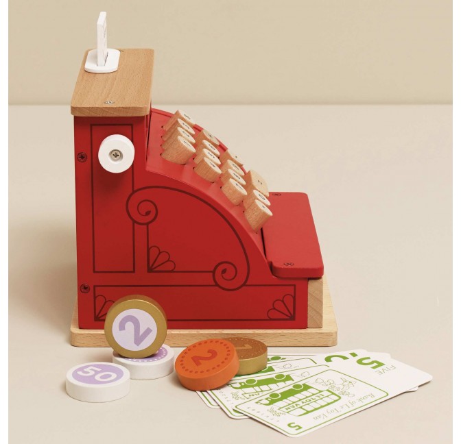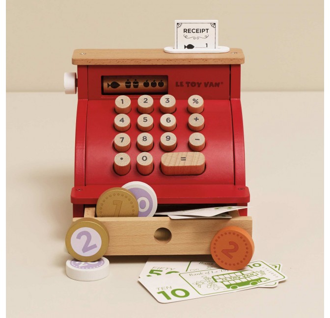 A robust wooden cash register. This retro style till includes a wooden till receipt, easy open cash drawer plus wooden & paper play money. Vintage detailing illustrated on the sides in golden paint adds the finishing touch.