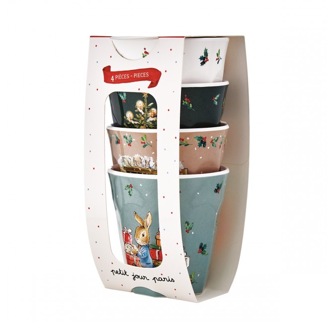 Un set festif qui réunit 4 gobelets à facettes aux décors de Noël avec Pierre Lapin : sapin illuminé, cadeaux, bonhomme de neige et moments...