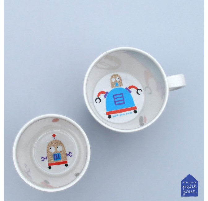 Un joli set de 5 pièces, avec rebords ergonomiques pour aider l'enfant à prendre les aliments et manger presque tout seul. Une assiette, un bol,...
