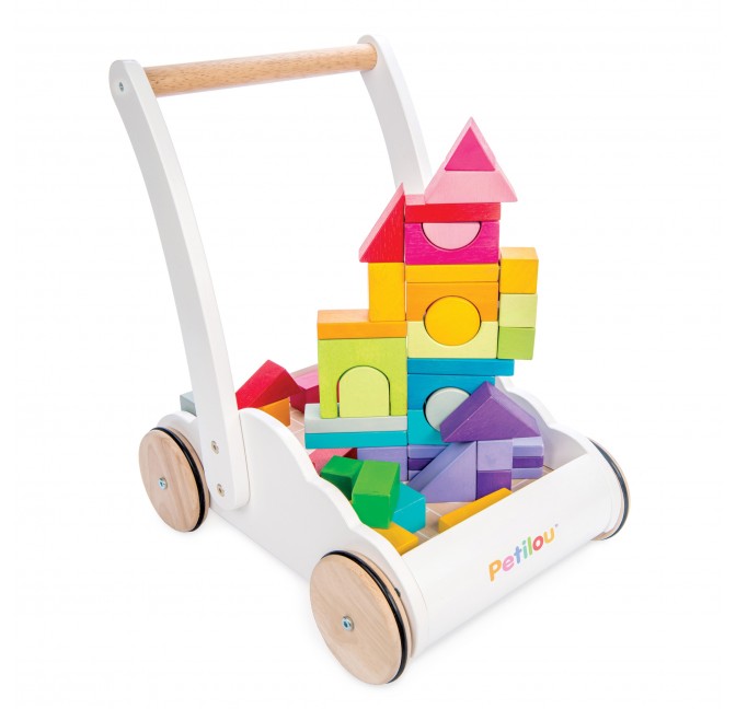 Un chariot de marche unique en forme de nuage doux avec 45 blocs de bois peints dans de belles couleurs d'arc-en-ciel teintées à l'eau.