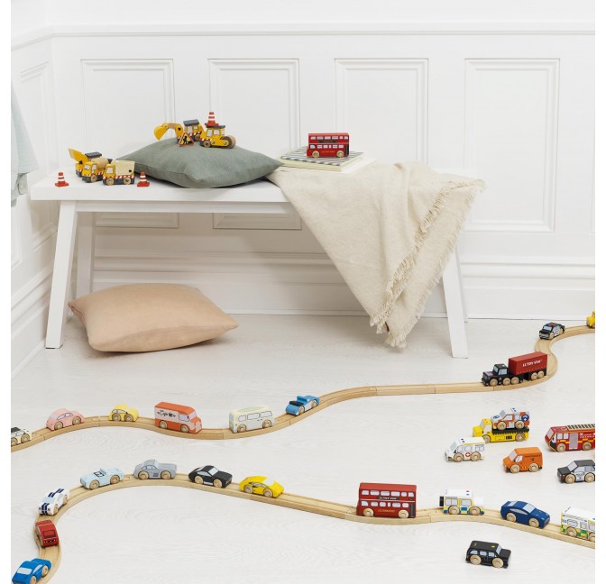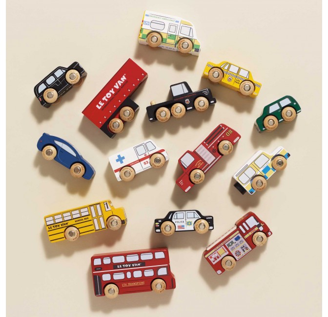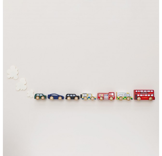 Ce joli set en bois FSC™ réunit 7 véhicules emblématiques de Londres : le célèbre "Bus à impériale" Londonien rouge à étage, le taxi noir, le camion de pompiers, le fourgon de police, l’ambulance et deux voitures de sport. Avec leurs roues en bois ,tous ces véhicules sont également compatibles avec les circuits de train en bois standard.