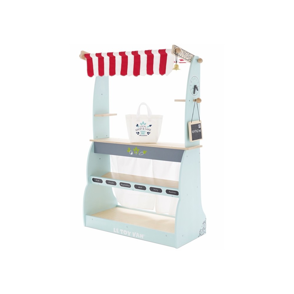Ce charmant stand en bois FSC™ combine boutique et café grâce à sa structure réversible. Il est livré avec un tableau noir réversible et une clochette pour plus de fun.
