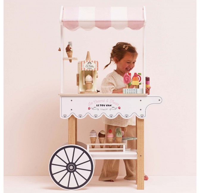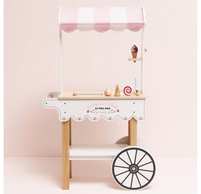Ce charmant chariot à glaces en bois FSC™ aux couleurs rose et blanc est parfait pour les petits marchands et les amateurs de douceurs. Il possède des roues d’un côté et une poignée de l’autre, pour être facilement poussé et manipulé pendant le jeu.