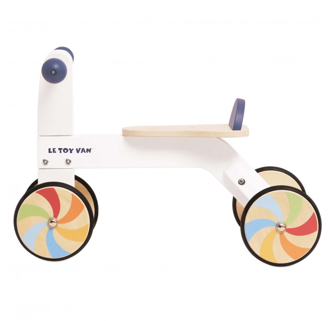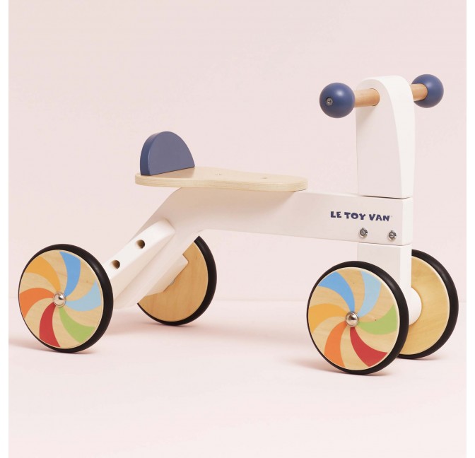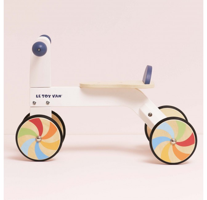 Ce magnifique porteur en bois FSC™ allie design élégant et esprit ludique. Avec sa finition blanche et bleu foncé et ses roues ornées de moulins multicolores, il invite à des balades pleines de gaieté.