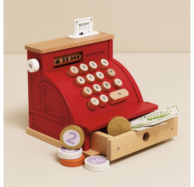 Cette caisse de style rétro comprend un ticket de caisse en bois, un tiroir-caisse à ouverture facile ainsi que des pièces de monnaie en bois et des billets. Des détails illustrés sur les côtés avec de la peinture dorée ajoutent la touche finale.