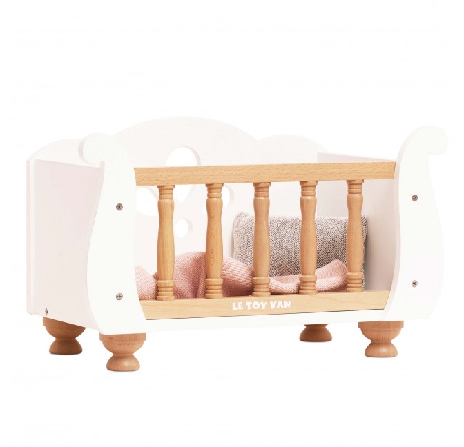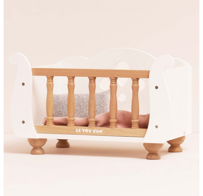 Ce ravissant lit de poupée en bois FSC™ séduit par ses jolis barreaux et ses pieds élégants. Livré avec un drap, un oreiller et une couverture toute douce, il offre un cocon de confort pour les poupées et doudous de 30 à 35 cm.