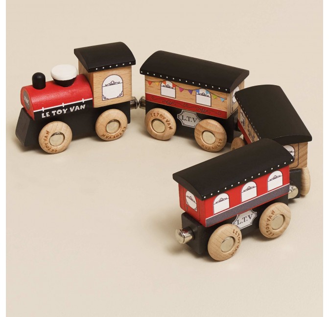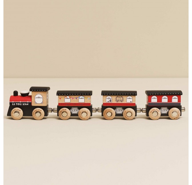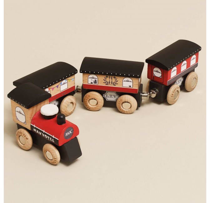 Voyagez avec élégance à bord du Royal Express ! Ce magnifique train comprend une locomotive et ses trois wagons en bois FSC™, reliés par des aimants pour être facilement assemblés, tirés ou détachés.
