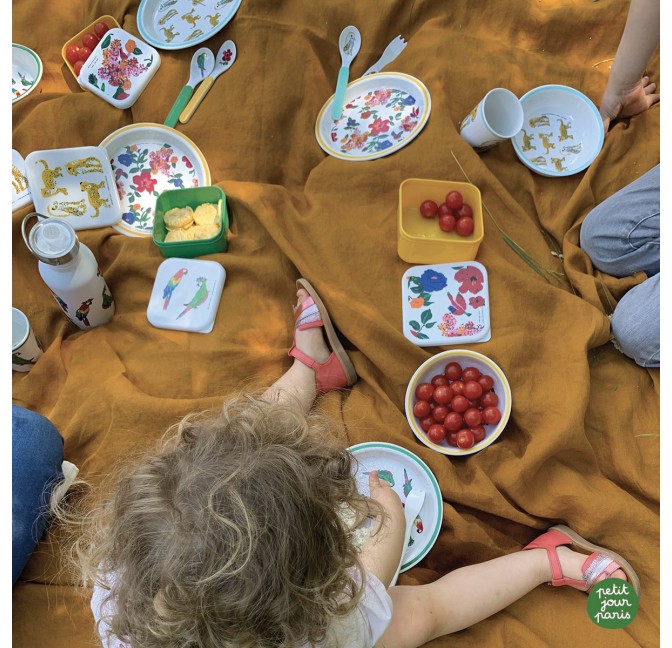 Un joli set de 5 pièces, avec rebords ergonomiques pour aider l'enfant à prendre les aliments et manger presque tout seul. Une assiette, un bol,...