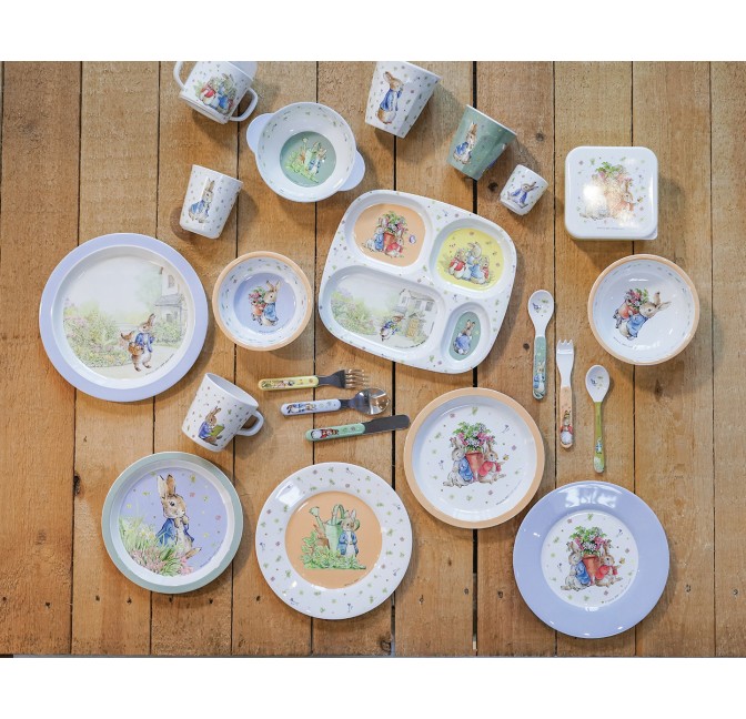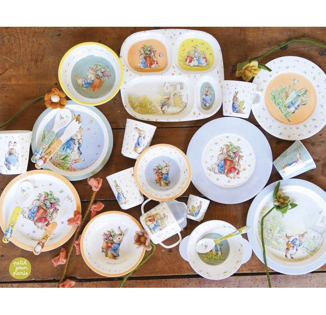 Un joli set de 5 pièces, avec rebords ergonomiques pour aider l'enfant à prendre les aliments et manger presque tout seul. Une assiette, un bol,...