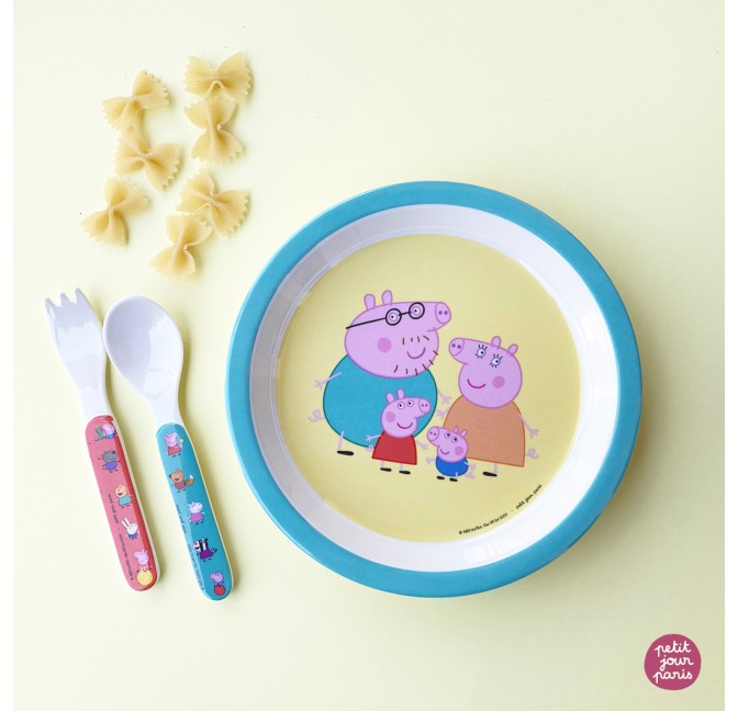 Une assiette avec des rebords pour manger tout seul, avec une petite cuillère facile à prendre en main et une mini fourchette.